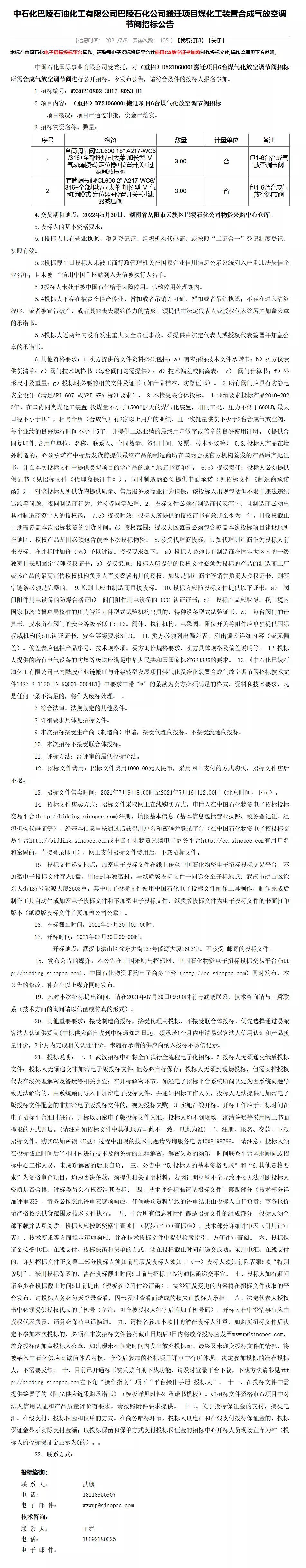 中石化巴陵石化巴陵石化搬遷項目煤化工裝置合成氣放空調節閥招標公告