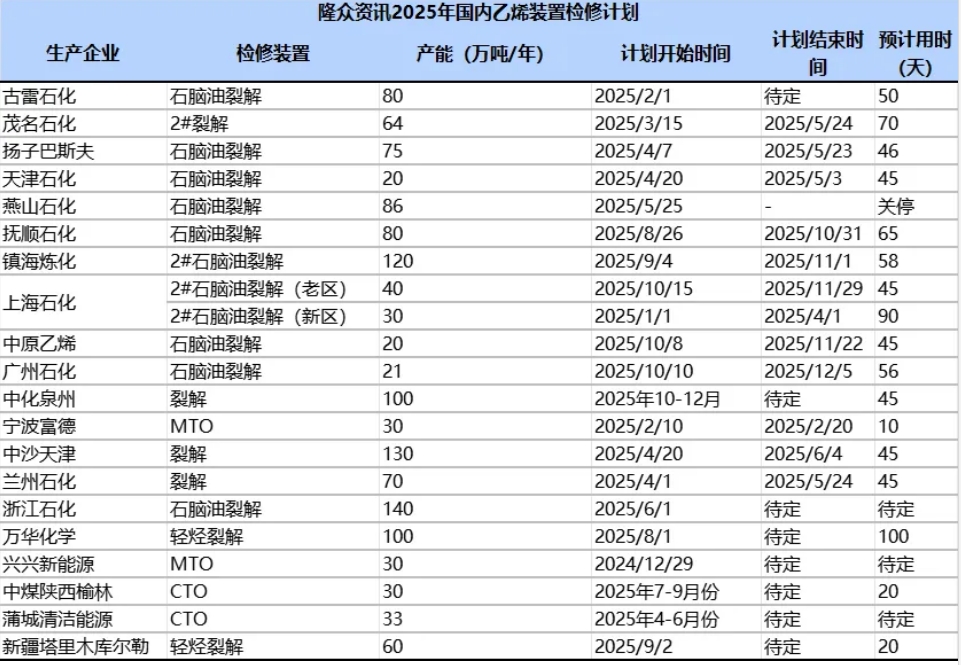 圖1 2025年國內(nèi)乙烯裝置檢修計(jì)劃