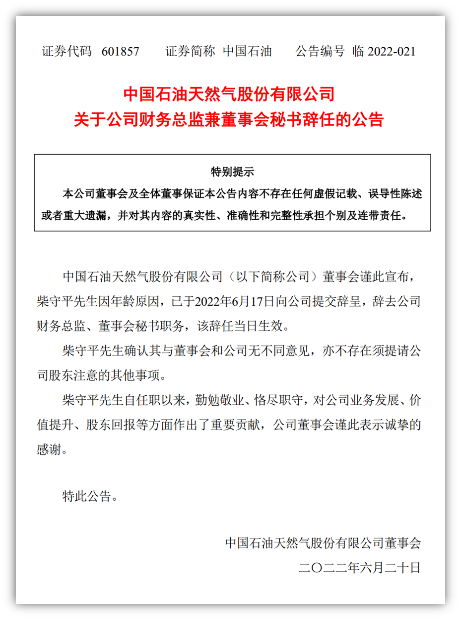 中國石油天然氣股份有限公司(以下簡稱公司)董事會宣布, 柴守平先生因年齡原因,已于2022年6月17日向公司提交辭呈,辭去公司財務總監(jiān)、董事會秘書職務,該辭任當日生效。