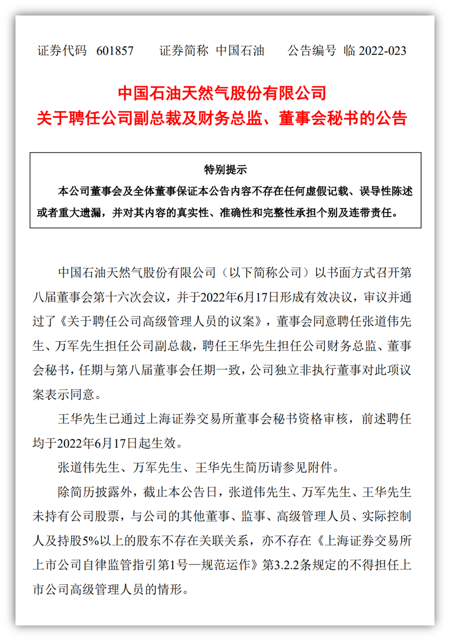中國石油天然氣股份有限公司以書面方式召開第八屆董事會第十六次會議,并于2022年6月17日形成有效決議,審議并通過了《關于聘任公司高級管理人員的議案》,董事會同意聘任張道偉先生、萬軍先生擔任公司副總裁,聘任王華先生擔任公司財務總監(jiān)、董事會秘書,任期與第八屆董事會任期一致,公司獨立非執(zhí)行董事對此項議案表示同意。