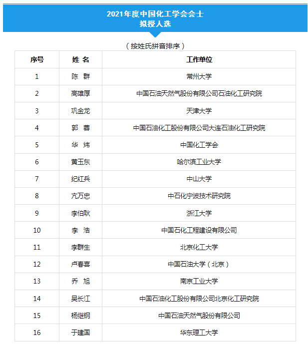 根據(jù)《中國(guó)化工學(xué)會(huì)會(huì)士條例》和《中國(guó)化工學(xué)會(huì)會(huì)士評(píng)選工作實(shí)施方案》,中國(guó)化工學(xué)會(huì)于2021年1月啟動(dòng)了2021年度中國(guó)化工學(xué)會(huì)會(huì)士的評(píng)選組織工作。經(jīng)學(xué)會(huì)會(huì)士和有關(guān)單位提名、形式審查、專家初評(píng)、會(huì)議最終評(píng)審等程序,評(píng)選出陳群等16人擬授予中國(guó)化工學(xué)會(huì)會(huì)士,現(xiàn)將擬授予人選予以公示。