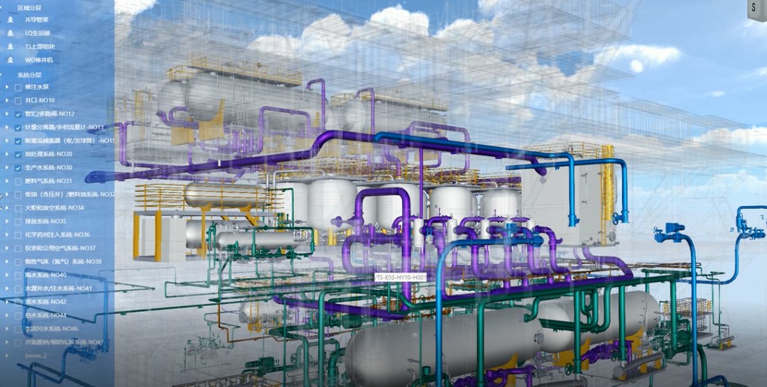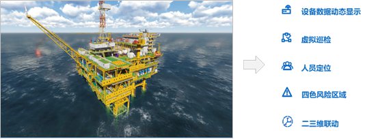 以推進智能油田建設為例,針對安全管理、設備設施管理,以“三維可視化引擎”和“三維數字孿生模型”技術為基礎,開發的“三維可視化協同工作平臺”,具有設備數據動態顯示、四色風險區域顯示、虛擬巡檢、人員定位、二三維數據聯動等多項功能,有效解決了現場支持成本高、運維時效低、海陸溝通難等問題,實現了工程技術與信息技術的高度融合。