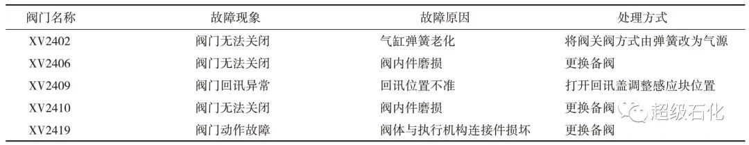 某石化公司S Zorb裝置上一生產周期主要程控閥故障及處理方式見表1。依照經驗制定針對性預防性維護措施。針對設備的特性和工況制定周期性的定期維護方案,降低設備故障發生頻率。