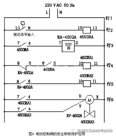 1.2電動控制閥的安全聯(lián)鎖保護電動控制閥的電動執(zhí)行器是以220V交流單項電源作為驅(qū)動電源,接受來自調(diào)節(jié)器的毫安信號或電壓控制信號來進行工作的。現(xiàn)在國內(nèi)的電動控制閥大多采用進口的日本工裝電子式電動執(zhí)行器,電子式控制單元常被設(shè)計成黑匣子形式,并用樹脂澆鑄,驅(qū)動電機采用交流可逆電機,可以正驅(qū)動或反驅(qū)動;驅(qū)動量的反饋檢測采用高性能的、高可靠性的電位器,以實現(xiàn)控制調(diào)節(jié)功能。切斷或調(diào)節(jié)電動控制閥的安全聯(lián)鎖保護歸根結(jié)底是通過安全聯(lián)鎖信號對驅(qū)動電機的驅(qū)動電源的控制,以實現(xiàn)驅(qū)動電機的正轉(zhuǎn)或反轉(zhuǎn),來達到對控制閥的打開或關(guān)閉的目的。因此只要將安全聯(lián)鎖信號作為接點信號接人電動控制閥的電源控制回路中,當(dāng)安全聯(lián)鎖信號動作時,也就是接點信號動作,使得正驅(qū)動電源或反驅(qū)動電源接通,實現(xiàn)控制閥的打開或關(guān)閉。圖4所示為電動控制閥較復(fù)雜的安全聯(lián)鎖保護接線圖,通過接入定時器聯(lián)鎖控制電動控制閥的打開和關(guān)閉。在圖4行2中,引入安全聯(lián)鎖保護接點信號,接點閉合時,繼電器4503KA線圈得電,行3中4503KA常開接點7-4閉合,定時器KA-4502A開始計時,行4中4503KA常開接點8-5閉合,繼電器4503KA1線圈得電,行6中4503KA1常開接點7-4閉合,電動控制閥4503KA3正轉(zhuǎn),閥門打開;當(dāng)定時器KA-4502A計時到設(shè)定值時,其觸點動作,行4中定時器KA-4502A常聞接點8-5打開,繼電器4503KA1線圈失電,行6中4503KA1常開接點7-4打開,電動控制閥4503KA3正轉(zhuǎn)失電,同時行5中KA-4502A觸點8-6閉合,繼電器4503KA2線圈得電,行6中4503KA2常開接點7-4閉合,電動控制閥4503KA3反轉(zhuǎn)得電,閥門關(guān)閉。