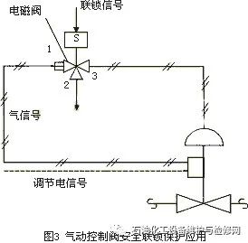 1.1.3氣動控制閥安全聯(lián)鎖保護氣動控制閥用于安全聯(lián)鎖動作時,在氣源信號線上增加電磁閥,電磁閥的配氣由I/P閥門定位器調(diào)節(jié),安全聯(lián)鎖動作時,關(guān)閉或打開控制閥。其應(yīng)用如圖3所示。