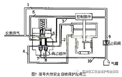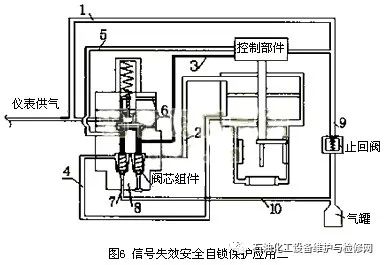 2.1.1信號失效氣動控制閥全開或全關(guān)安全保護在圖5中,1號管路為儀表供氣管路,2號管路為給氣缸頂部壓力的管路,3號管路為給氣缸頂部控制壓力的管路,4號管路為給氣缸底部壓力的管路,5號管路為給氣缸底部控制壓力的管路,6號為鎖定部件上下膜片來回運動的排氣口,7號為儲氣罐提供給氣缸底部的供氣口,8號為儲氣罐提供給氣缸頂部的供氣口,9號管路為儲氣罐提供給控制部件供氣壓力的管路,10號管路為儲氣罐提供給氣缸頂部或底部供氣壓力的管路。