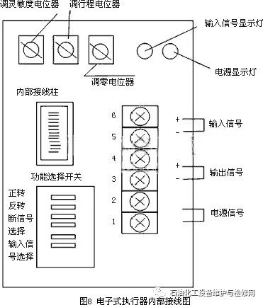 在以上的信號失效控制閥安全保護示意圖中,止回閥在信號失效時,會保證儲氣罐的儲氣壓力輸送到氣缸的頂部、底部或頂部和底部。當(dāng)供氣壓力恢復(fù)到正常時,止回閥恢復(fù)到原來的位置,以保證儲氣罐充滿所需要的氣壓,以備下次信號失效時繼續(xù)發(fā)揮它的作用。2.2信號失效電動控制閥的安全保護電動控制閥的關(guān)鍵部件在于其內(nèi)部樹脂澆鑄的控制器,其接受來自調(diào)節(jié)器的毫安或電壓信號和來自開度檢測器的開度信號,將兩信號相比較并放大,向消除其差值的方向驅(qū)動和控制電機,其結(jié)果是使得來自調(diào)節(jié)器信號和開度信號之間的偏差被減小,當(dāng)偏差消除時控制部分令電機停止在該位置上,達到調(diào)節(jié)和控制的目的。當(dāng)信號失效時,輸出軸在相應(yīng)的時間內(nèi)仍處于運轉(zhuǎn)狀態(tài),如果沒有相應(yīng)的控制措施,會停留在某一個位置,而失去對電動控制閥的安全保護。根據(jù)工藝過程的需要,在電動控制閥的設(shè)計選型和安裝過程中,就應(yīng)該注意到信號失效時電動控制閥的安全保護。在圖8電動控制閥電子式執(zhí)行器內(nèi)部接線圖中,信號失效時根據(jù)工藝過程的需要使閥門開度仍然處于信號失效前的位置時,將圖中的3和4斷開,接通5,就可以使輸出軸停止在原位置,使閥門開度保持不變。