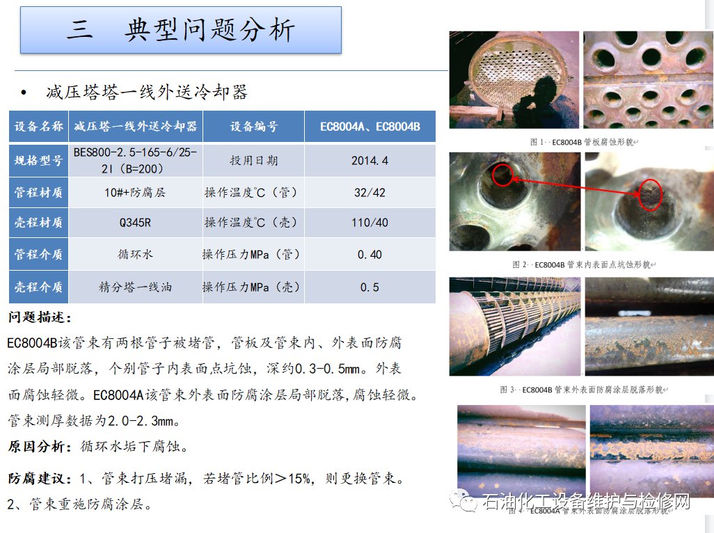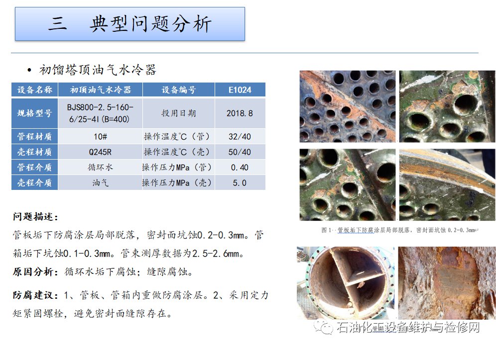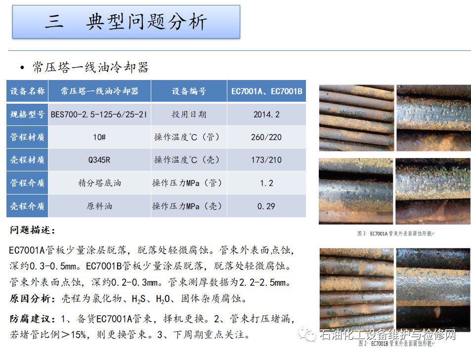 原因分析:H2S+HCl+H2O腐蝕、銨鹽垢下腐蝕、偏流沖蝕。