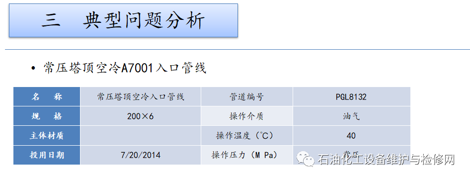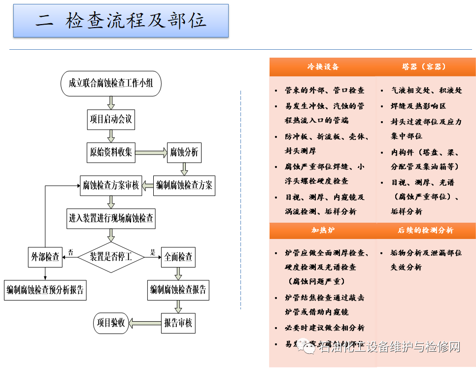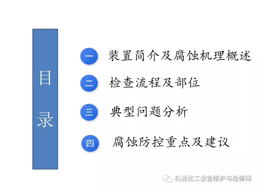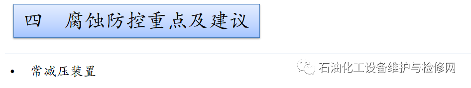 常減壓裝置,常壓塔頂循以上部位及其冷凝冷卻系統;焦化裝置,分餾系統分餾塔的濕硫化氫腐蝕及水冷器的循環水垢下腐蝕。