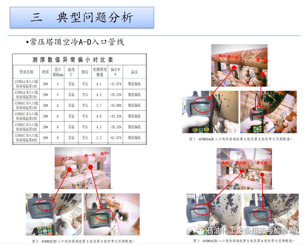 常壓塔頂空冷A/B入口線的南端起第1組及第2組的彎頭實測數值分別為4.1-5.0mm和4.3-5.4mm。常壓塔頂空冷C/D入口線的南端起第1組及第2組的彎頭實測數值分別為2.7-3.8mm和4.1-5.5mm。第5組及第6組的彎頭實測數值分別為4.3-5.1mm和2.3-4.3mm。最小數值與設計規格相比較,偏差率達到-20%以上。