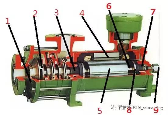 1.泵體 2.葉輪 3.前導(dǎo)軸承 4.定子 5.轉(zhuǎn)子 6.軸 7.后導(dǎo)軸承 8.推動盤 9.軸承監(jiān)視器
