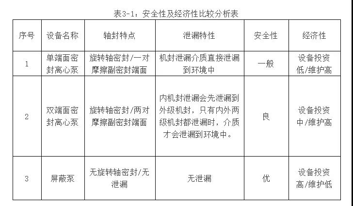 綜上所述,單端面密封離心泵、雙端面密封離心泵、屏蔽泵在輸送甲醇危險物料時,安全性及經(jīng)濟(jì)性比較如下表3-1所示: