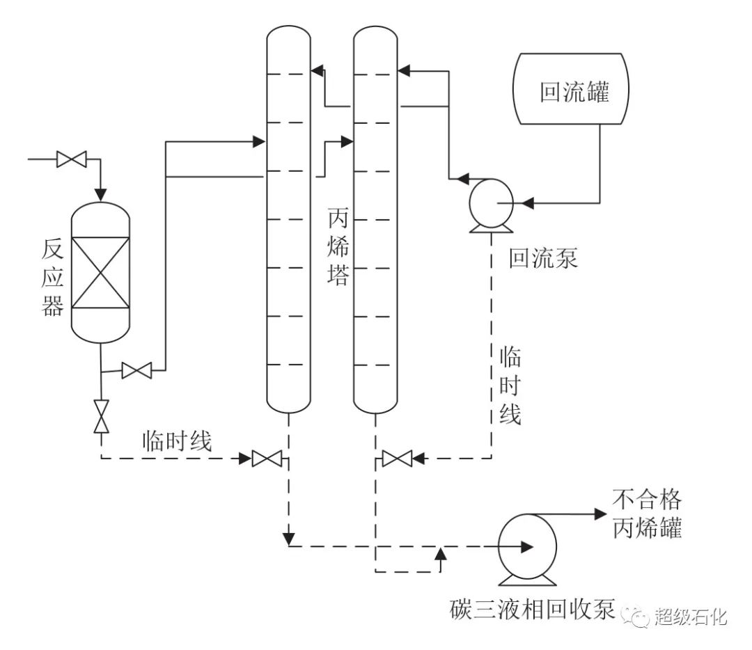 分離單元停工后,受雙丙烯精餾塔內(nèi)塔盤積液下落和碳三加氫反應器不允許排放火炬的限制,造成丙烯精餾塔塔釜滿液位和碳三加氫反應器內(nèi)液相物料無法導液的困難。臨時增加了回收流程,將丙烯精餾塔內(nèi)、丙烯回流系統(tǒng)和碳三加氫反應器內(nèi)的碳三液相物料回收至碳三回收泵入口,經(jīng)泵送出至丙烯不合格罐,完成全部碳三液相物料的回收。增加臨時物料回收流程見圖5。丙烯機作為最后停工的部分保持低負荷至無負荷運轉(zhuǎn),在無負荷運轉(zhuǎn)情況下,通過調(diào)整收集各段間罐液相丙烯至丙烯機一段罐,通過丙烯回收泵送至丙烯儲罐。