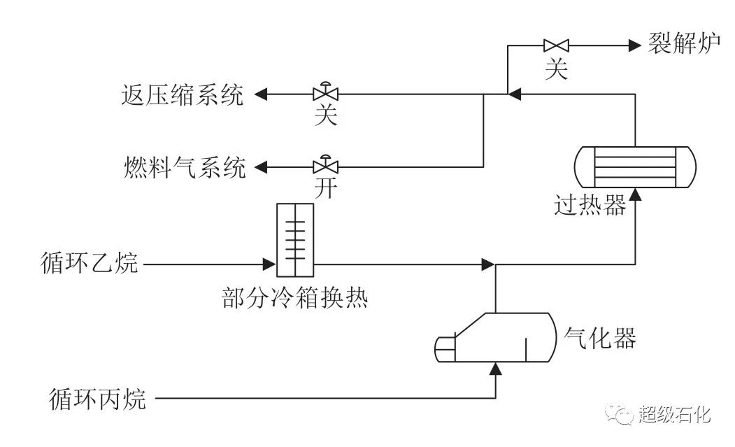 為順利完成碳三系統(tǒng)氣相物料的回收,設(shè)定丙烯機至丙烯塔;碳三加氫反應器至丙烯塔流程,通過循環(huán)丙烷至裂解爐流程改變?yōu)檠h(huán)丙烷至燃料氣流程,循環(huán)C2/C3 氣相回收流程見圖6。按先低壓后高壓的順序進行回收。受燃料氣系統(tǒng)單位時間內(nèi)消耗量的限制,在進行碳三氣相物料回收時,確保碳二氣相物料回收結(jié)束。