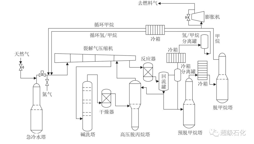 裂解氣大閥切出系統(tǒng)后,投用急冷水塔真空保護流程補入天然氣,裂解氣壓縮機進行天然氣置換,利用天然氣的露點低于裂解氣露點的特性,使系統(tǒng)內(nèi)裂解氣快速冷凝[1],同時各段間罐降液位操作,至裂解氣壓縮機各段間罐無液位運轉(zhuǎn)。為保證天然氣進入深冷單元的品質(zhì),堿洗塔繼續(xù)循環(huán)操作。高壓脫丙烷塔及回流罐無液位后切斷壓縮單元與熱分離系統(tǒng)聯(lián)系。建立壓縮單元和冷分離單元天富余部分進入燃料氣系統(tǒng),保持整個循環(huán)進行。