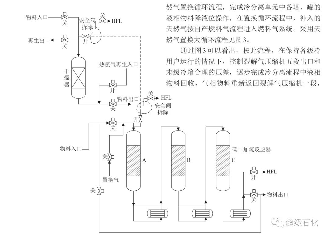 在停工過程中,由于裂解氣壓縮機增加了天然氣停工環(huán)節(jié),流程內(nèi)大部分系統(tǒng)完成了破液封操作,對于不在停工置換大流程內(nèi)的乙烯精餾塔、乙烯機、丙烯機、丙烯精餾塔、脫乙烷塔、碳三液相加氫反應器需單獨進行物料回收。