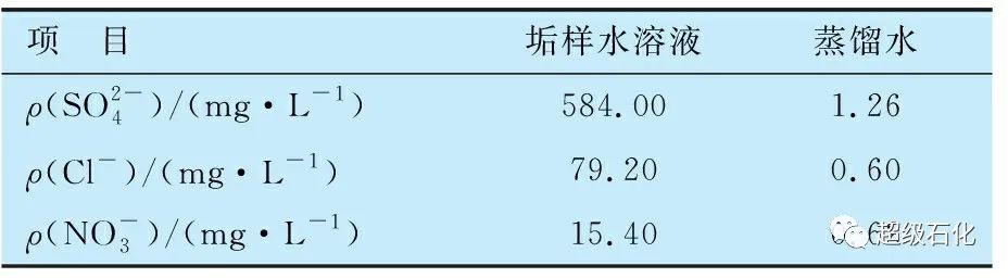 采用超聲波振蕩的方法將定量的垢樣充分溶解于定量的蒸餾水中,然后取上層清液過濾,利用離子色譜法(HPIC)測定水中的可溶性陰離子,并取蒸餾水進(jìn)行空白對照。