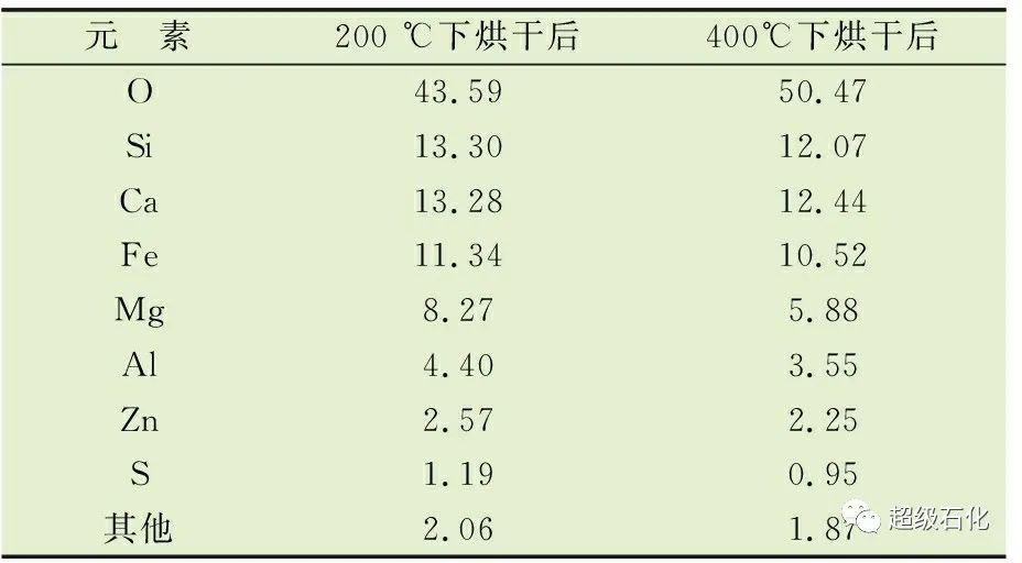 將垢樣在200 ℃和400 ℃下烘干去除水分和揮發(fā)性介質(zhì)后,采用能譜分析(EDS)測定其主要元素含量,采用X射線衍射(XRD)分析確定其化合物的主要存在形式。