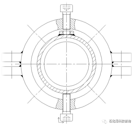 (1) 圖2、圖3是在夾具內(nèi)部加兩塊半圓形的加固板,其內(nèi)徑等于管道外徑。該加固板安裝前用螺栓與夾具內(nèi)連接,與夾具一起安裝覆蓋在孔洞和減薄部位上。緊固夾具后,使連接螺栓與加固板脫離,再用固定螺栓頂固加固板,即可按正常程序注入密封劑消除泄漏。為防止軸向應(yīng)力的破壞,夾具兩側(cè)應(yīng)與管道焊接成一體。